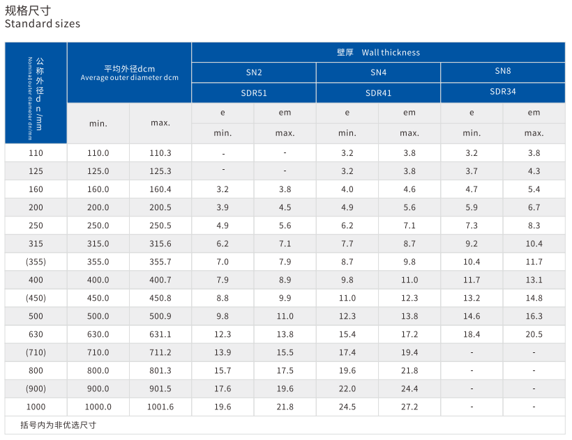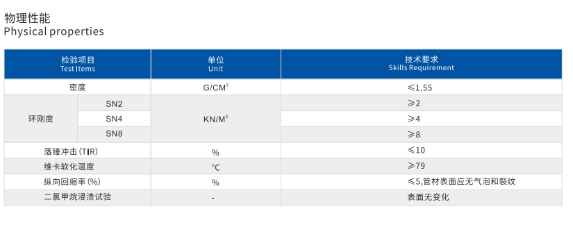 PVC-U無(wú)壓(yā)埋地排汙、排水用管材適用於室外埋地排汙、排水(shuǐ)係統。其係統連接方(fāng)式也分為兩(liǎng)種,承插式彈性密封圈連接適用於100mm--1000mm,粘連式連(lián)接適用於小口徑110mm-200mm,一般采用承插式彈性密封圈連接, 一般輸運溫度不(bú)宜(yí)超過60°C,本產品可用於非開(kāi)挖(wā)用頂管過程,通常長度為(wéi)3m,用於疏通(tōng)道路兩側的積水。