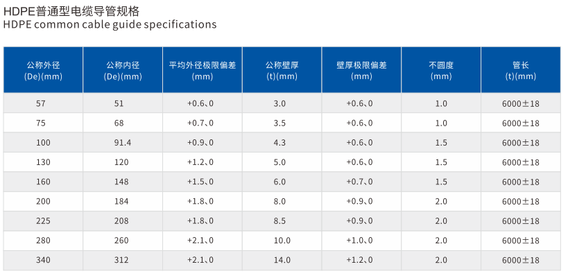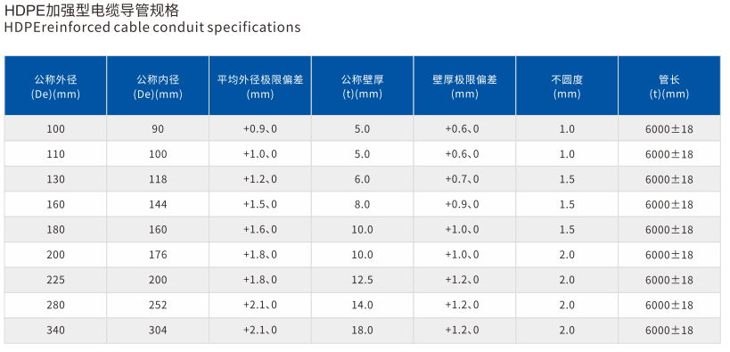 電纜導管分類為(wéi)普通(tōng)型、加強(qiáng)型,普通型(xíng)主要適用於綠化帶、人行(háng)道等多種(zhǒng)場合下的直埋;加強型主要適用於行車道等承壓場合下直埋、頂管。